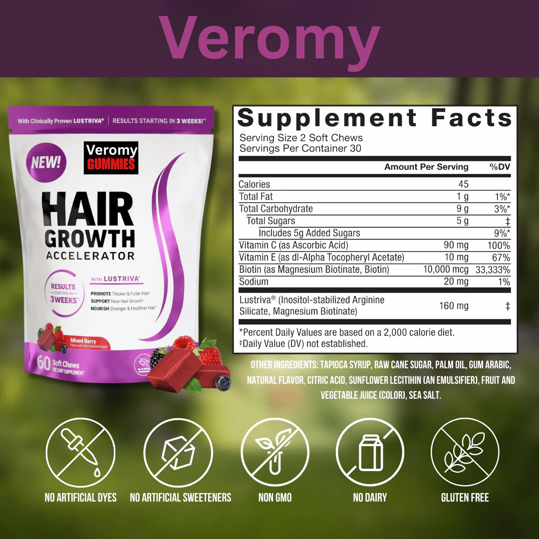 Veromy chews are designed to promote thicker, fuller hair, support new hair growth, and help reduce fine lines and wrinkles — all while tasting like a delicious berry treat.